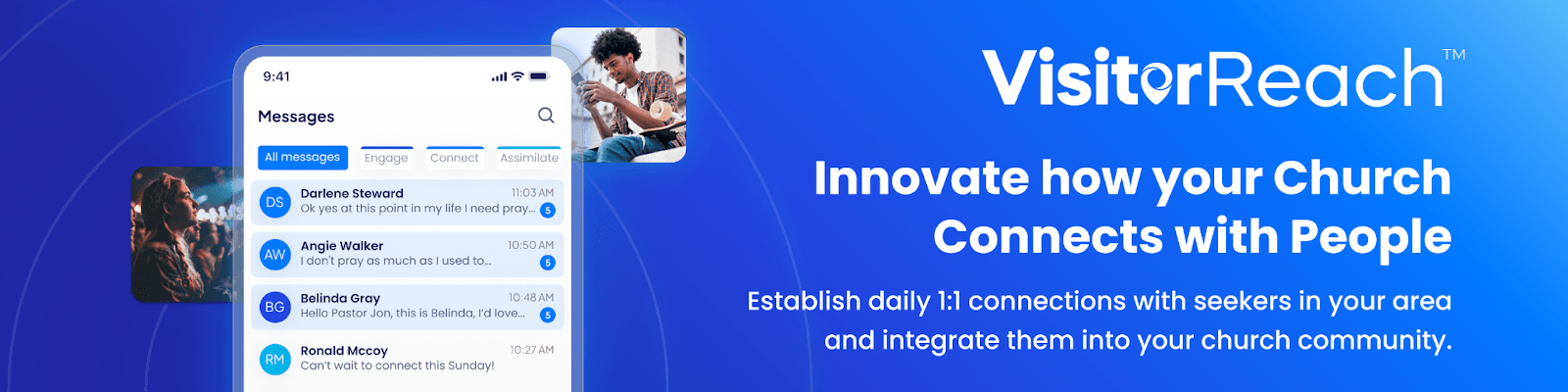- Real-time Text Messaging: Texting is the most effective way to communicate with people. With the VisitorReach app, churches can quickly connect with dozens to hundreds of new individuals each month, all while minimizing disruptions to their existing work schedules.